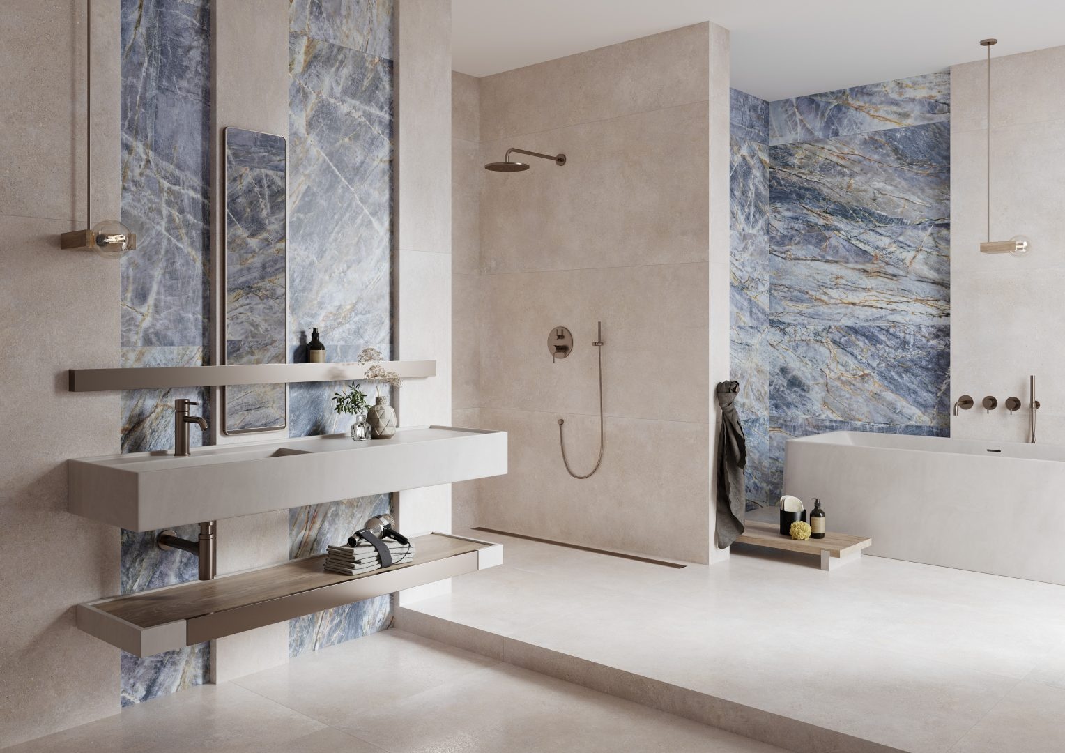 „Modern Concrete – piękno pełne kontrastów Uwodzi pośpiechem eklektycznych ulic, kokietuje sącząc do uszu muzykę nocnego życia, trzyma na dystans zimną, betonową szarością, by za chwilę zachwycić oślepiającym blaskiem neonow lub ukoić zmysły wyrastającą pomiędzy budynkami zielenią. Nowy Jork – Wielkie Jabłko – owoc miasta, ktory dla każdego ma zupełnie inny smak. Tak, jak w tej kulturalnej stolicy świata spotykają się rożne style i charaktery, tak inspirowana nim kolekcja Modern Concrete to gra skojarzeń i rożnorodnych estetyk. Nic nie jest tu jednoznaczne i oczywiste. Ponadczasowa szarość wychodzi naprzeciw beżom i zatraca się w spokojnej, czystej bieli. Struktury, zmienne jak natura Nowego Jorku, dają niczym nieograniczone możliwości aranżacyjne. Z klasą, ale nowocześnie. Minimalistyczne, ale imponująco. There you go!”