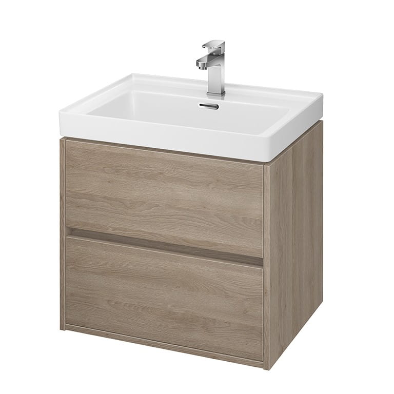 W skład zestawu wchodzą wisząca szafka podumywalkowa CREA 60 z umywalką meblową CREA 60. Front oraz korpus szafki wykonany z odpornej na wilgoć płyty wiórowej w kolorze dębu. Szafka jest wyposażona w system dotykowego otwierania (tzw. PUSH SYSTEM) oraz dwie pojemne szuflady. Wnętrze o strukturze szarego lnu nadaje szafce dodatkowego eleganckiego wyglądu. Umywalka CREA wytworzona jest z masy ceramicznej ROCKLITE, dzięki czemu jest zadziwiająco wytrzymała jest lekka i o niezwykle cienkich ściankach.