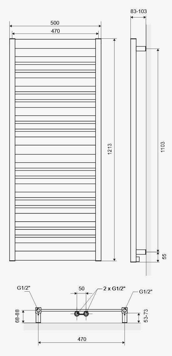 Grzejnik został wyposażony w zestaw otworów, pozwalających na podłączenie go zarówno w wersji dolnej centralnej (50 mm w osi dla zestawów zaworów zintegrowanych), jak i dolnej skrajnej na kolektorach (470 mm). Grzejnik ten wyposażony w grzałkę elektryczną, sprawdzi się doskonale jako całoroczna suszarka na ręczniki, zapewniająca ogrzewanie pomieszczenia i możliwość suszenia tekstyliów nawet poza sezonem grzewczym.