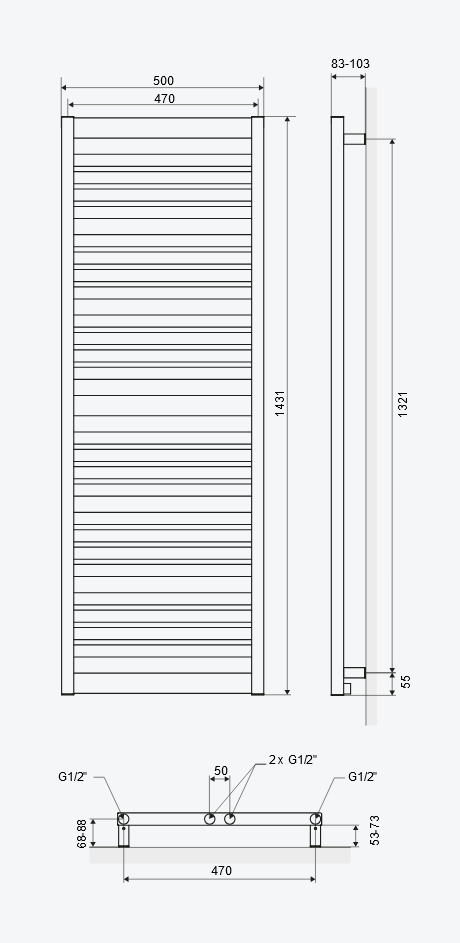 Grzejnik został wyposażony w zestaw otworów, pozwalających na podłączenie go zarówno w wersji dolnej centralnej (50 mm w osi dla zestawów zaworów zintegrowanych), jak i dolnej skrajnej na kolektorach (470 mm). Grzejnik ten wyposażony w grzałkę elektryczną, sprawdzi się doskonale jako całoroczna suszarka na ręczniki, zapewniająca ogrzewanie pomieszczenia i możliwość suszenia tekstyliów nawet poza sezonem grzewczym.