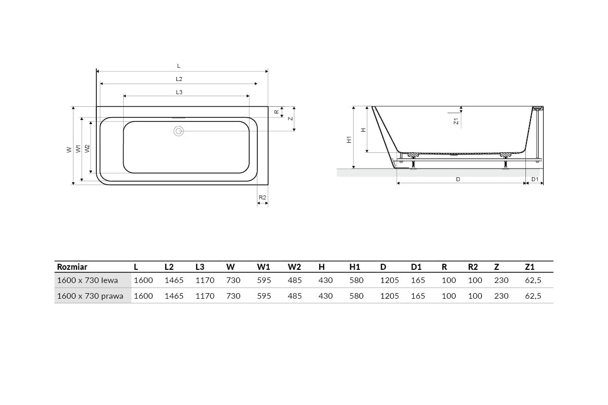 Wykonana jest z akrylu sanitarnego 100% Występuje w rozmiarze 160 cm, oraz wersji prawej i lewej