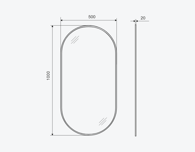 Tafla szkła jest dodatkowo zabezpieczona podklejoną z tyłu folią ochronną, która w razie stłuczenia lustra niweluje możliwość rozpryśnięcia się odłamków szkła i skaleczenia przez użytkownika. Lustro dostępne jest w rozmiarze: 1000 x 500 mm. Dostępne kolory ramy: anoda czarny mat lub złota szczotkowana oraz lakierowany biały mat.