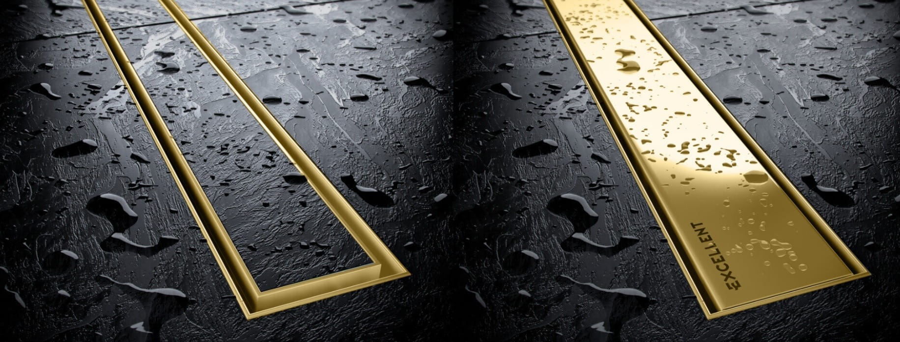 Odpływ liniowy Stilio Gold łączy w sobie minimalizm i praktyczność użytkową. Wykonany został z wysokiej jakości stali nierdzewnej, pokrytej powłoką PVD w kolorze złotym. Odpływ posiada wygodną regulację nóżek w pionie i w poziomie w zakresie do 30mm. Szeroki wybór dostępnych rozmiarów odpływów i wersji rusztu daje możliwość dostosowania do wielkości kabiny oraz wymiarów płytek, co znacznie ułatwia planowanie układu już na etapie projektowania. Produkt polecany jest do instalacji wraz z kabinami Excellent typu walk-in: Fabrika lub Vidoq.