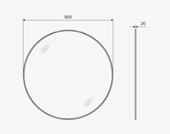 Tafla szkła jest dodatkowo zabezpieczona podklejoną z tyłu folią ochronną, która w razie stłuczenia lustra niweluje możliwość rozpryśnięcia się odłamków szkła i skaleczenia przez użytkownika. Dostępne średnice luster: 600 mm oraz 800 mm. Dostępne kolory ramy: anoda czarny mat lub złota szczotkowana oraz lakierowany biały mat.