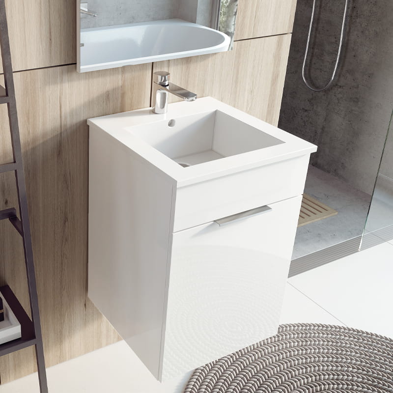 Set łazienkowy składający się z szafki i ceramicznej umywalki.