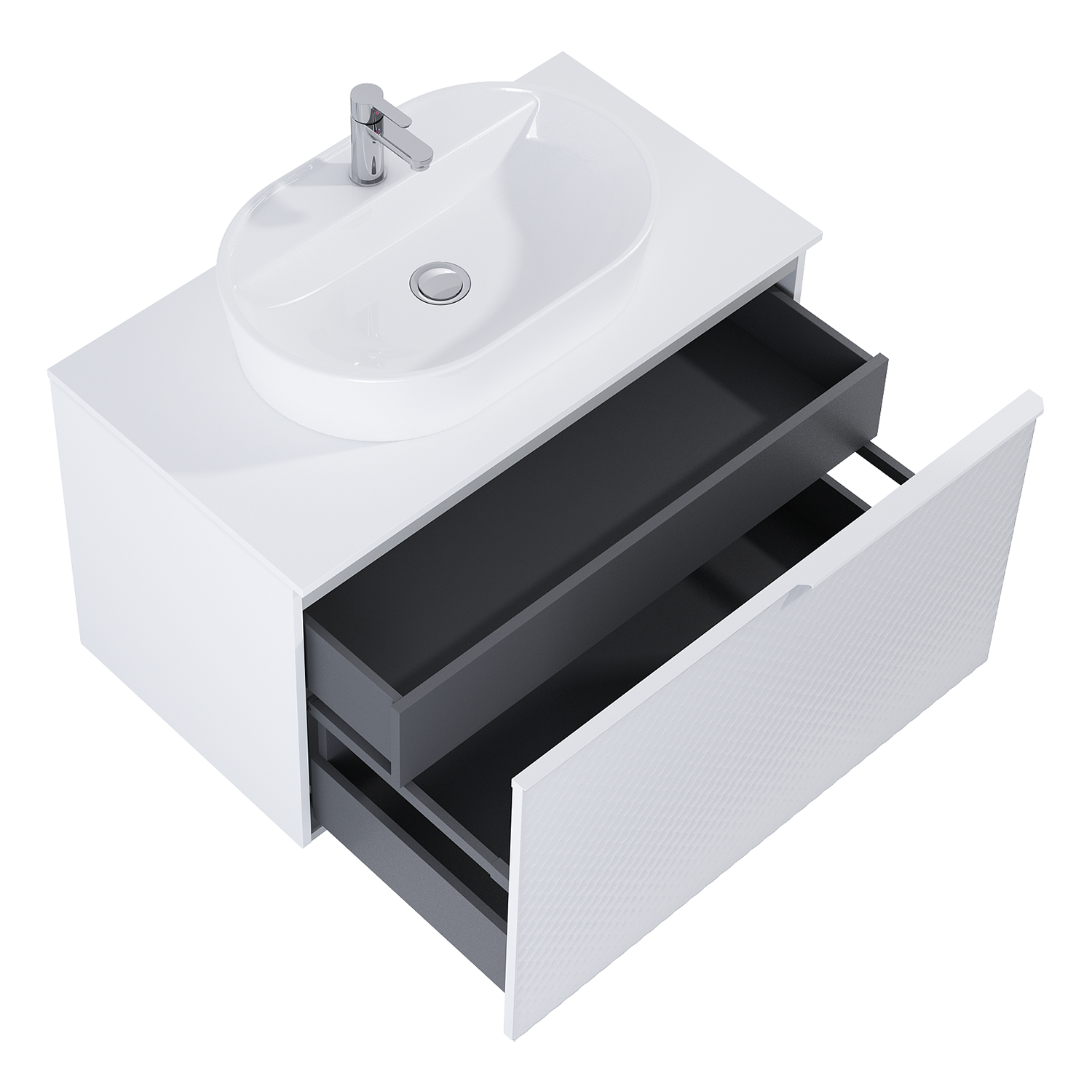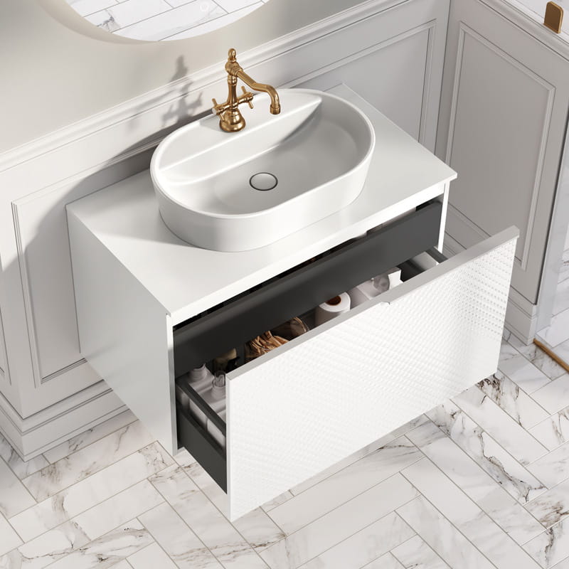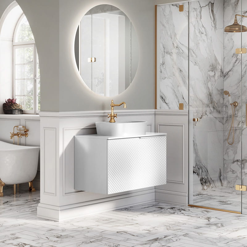 Kolekcja mebli łazienkowych Glam to unikatowe połączenie imponującej szafki z blatami ElitStone i umywalkami nablatowymi.