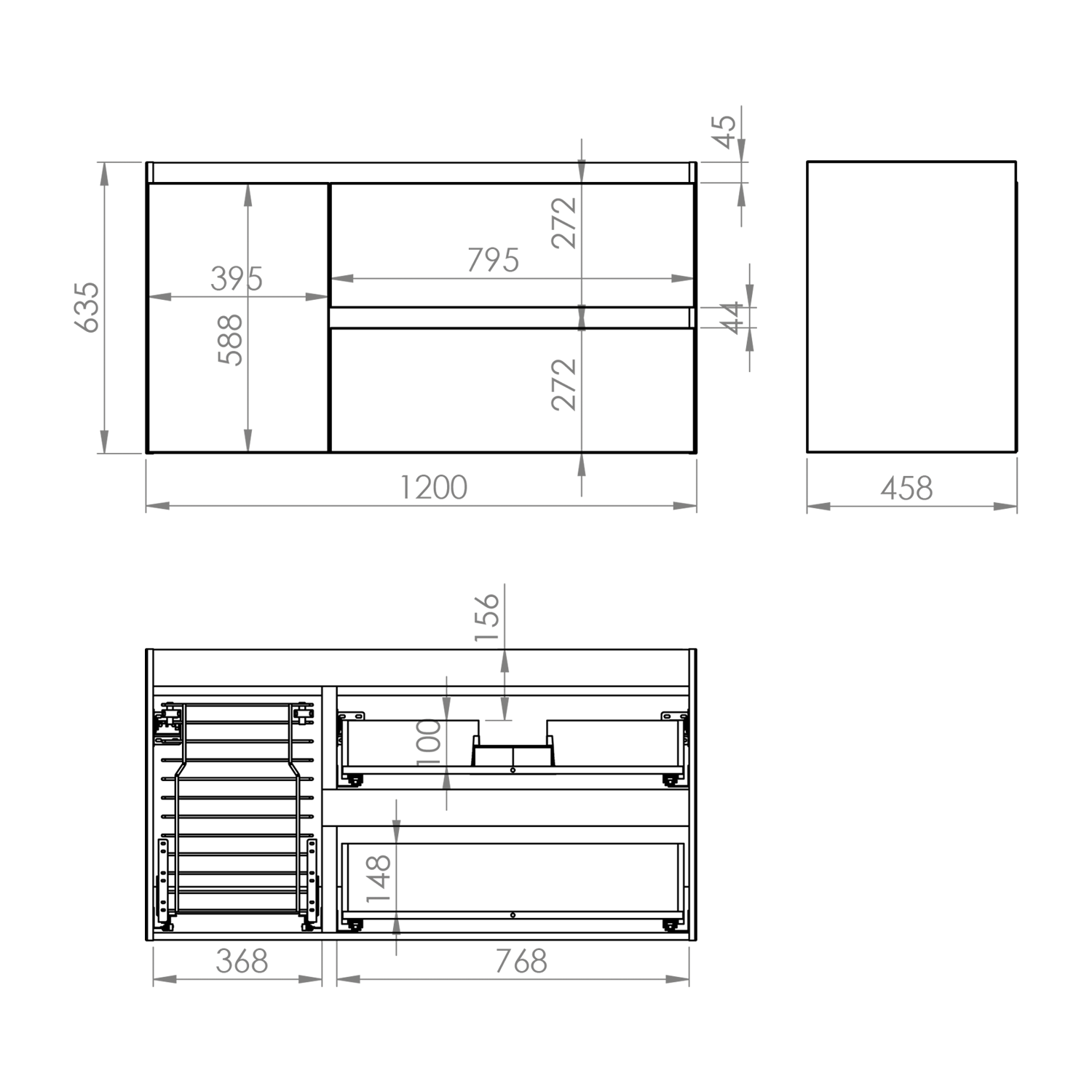 Szafka podumywalkowa – konieczność kompletacji z umywalką meblową lub zestawem blat + umywalka nablatowa. Szafka Split 120 składa się z szafki podumywalkowej 80cm i komody 40cm z koszem cargo