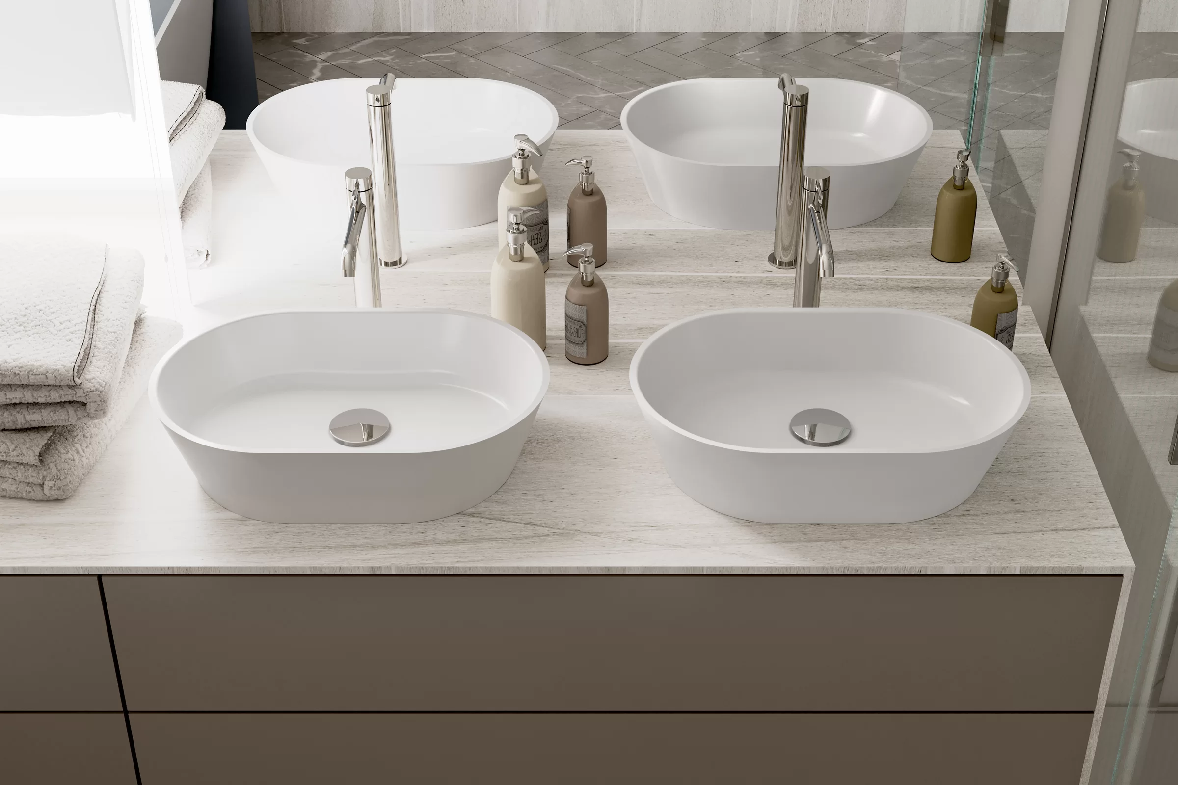 Umywalka nablatowa z kolekcji Bahama jest najbardziej uniwersalnym modelem Inbalia: jest kompaktowa, funkcjonalna, a owalny kształt misy gwarantuje świetne dopasowanie do każdej stylistyki łazienki. Niewielki rozmiar pozwoli Ci zamontować ją tam, gdzie brakuje miejsca – na małej szafce, we wnęce, a nawet w toalecie. Masz dużo przestrzeni na blacie? Zwiększ funkcjonalność swojej łazienki i postaw dwie obok siebie. Umywalka Bahama to świetny wybór – jest odlana z trwałego i odpornego na zarysowania lanego marmuru AQUASTONE®+ , którego łatwość pielęgnacji pozwoli utrzymać umywalkę w codziennej czystości.