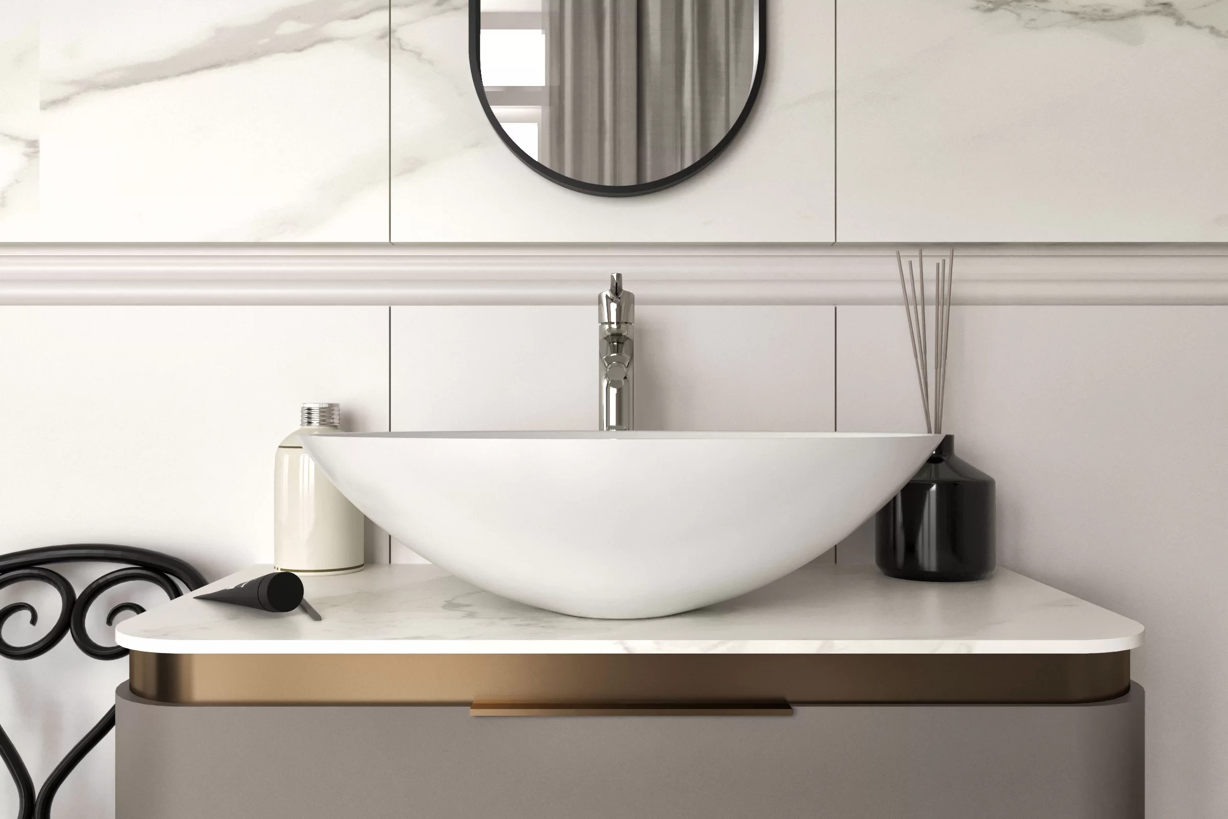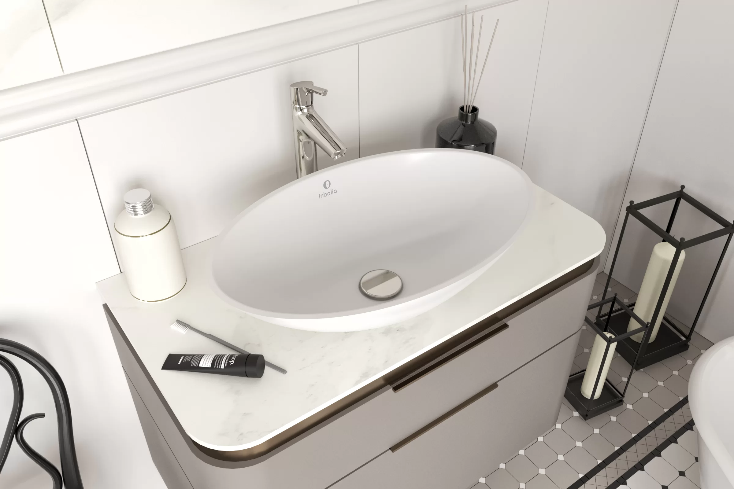 Umywalka nablatowa z kolekcji Sycylia to prawdziwy klejnot wśród umywalek Inbalia – ma miękką, zwężającą się ku podstawie misę, a jej wysoki rant chroni blat przez zachlapaniem i zabrudzeniami. Ciesz się świetnym designem, nawet w łazience – Sycylia przyciąga wzrok swoim kształtem dzięki czemu każdej łazience nada elegancji i niepowtarzalnego stylu. Umywalka Sycylia to świetny wybór jeśli poszukujesz wyrafinowanych kształtów i funkcjonalności w jednym – jest odlana z trwałego i odpornego na zarysowania lanego marmuru AQUASTONE®+ , którego łatwość pielęgnacji pozwoli utrzymać umywalkę w codziennej czystości.