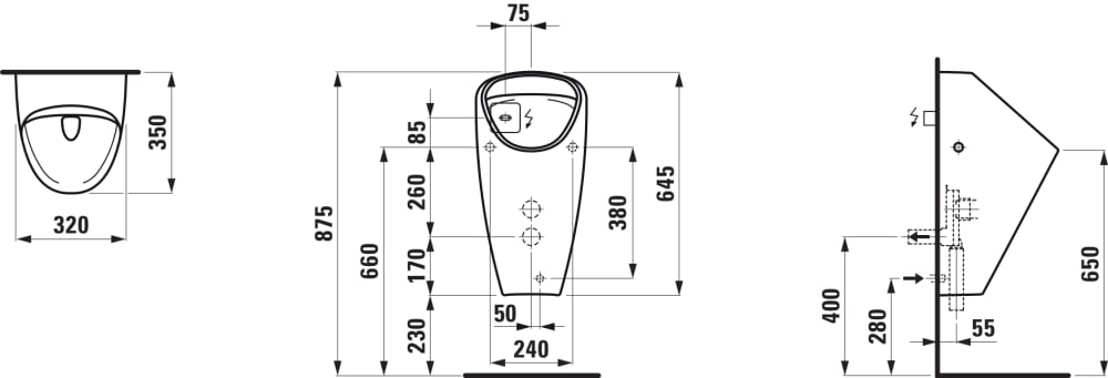 Laufen CAPRINO PLUS RIMLESS Pisuar ścienny z elektronicznym radarowym zaworem spłukującym. H8410650004011