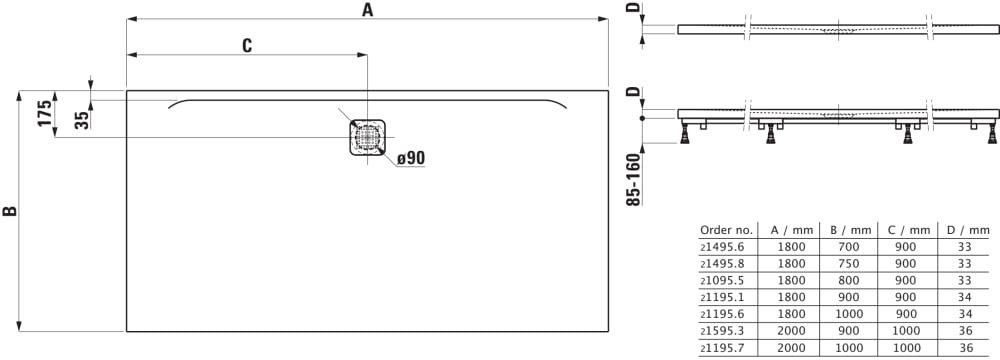 Brodzik Laufen PRO wykonany z materiału Marbond, delikatna struktura powierzchni, ultrapłaski, prostokątny, odpływ na długim boku, możliwość docinania z 3 stron