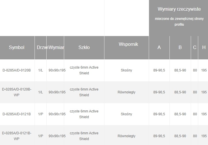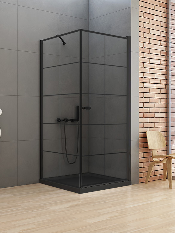 kabina kwadratowa, drzwi uchylne pojedyncze otwierane na zewnątrz i do wewnątrz, bezpieczne hartowane szkło 6 mm pokryte powłoką ochronną Active Shield
