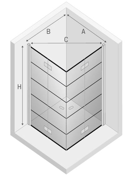 kabina kwadratowa lub prostokątna, drzwi składane uchylne podwójne otwierane na zewnątrz i do wewnątrz, bezpieczne hartowane szkło 6 mm pokryte powłoką ochronną Active Shield.