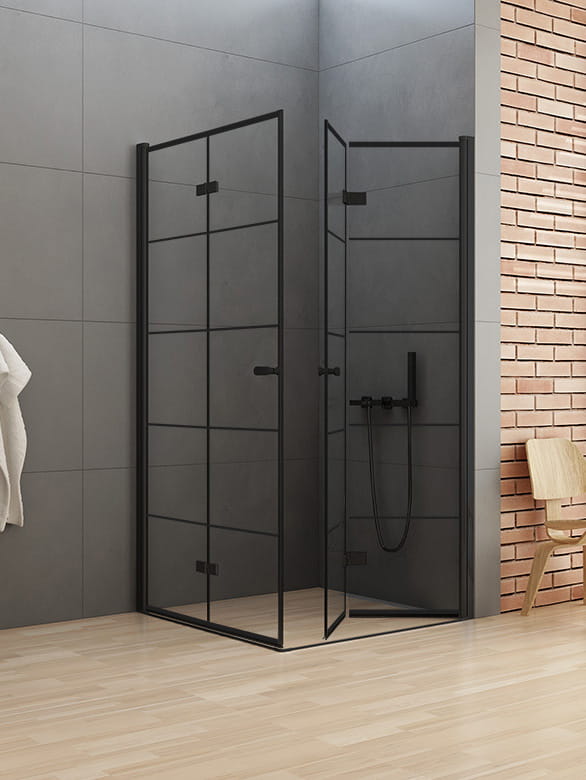 kabina kwadratowa lub prostokątna, drzwi składane uchylne podwójne otwierane na zewnątrz i do wewnątrz, bezpieczne hartowane szkło 6 mm pokryte powłoką ochronną Active Shield.