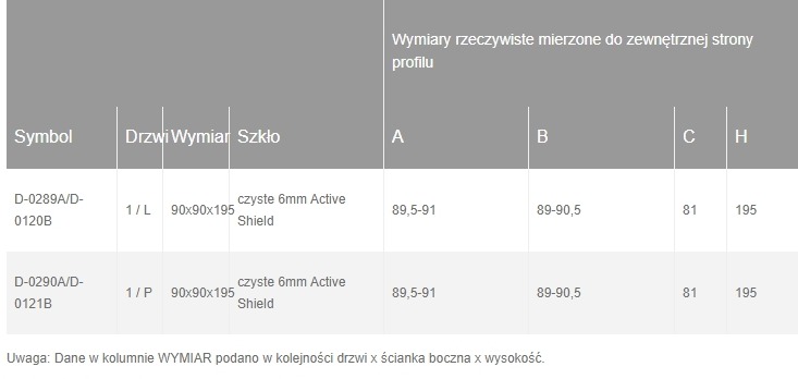kabina kwadratowa, drzwi składane uchylne pojedyncze otwierane na zewnątrz i do wewnątrz, bezpieczne hartowane szkło 6 mm pokryte powłoką ochronną Active Shield.