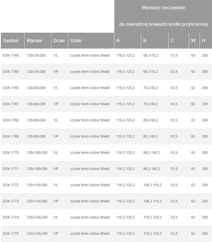 kabina kwadratowa i prostokątna,drzwi prysznicowe uchylne pojedyncze otwierane na zewnątrz, bezpieczne hartowane szkło 6 mm pokryte powłoką ochronną Active Shield