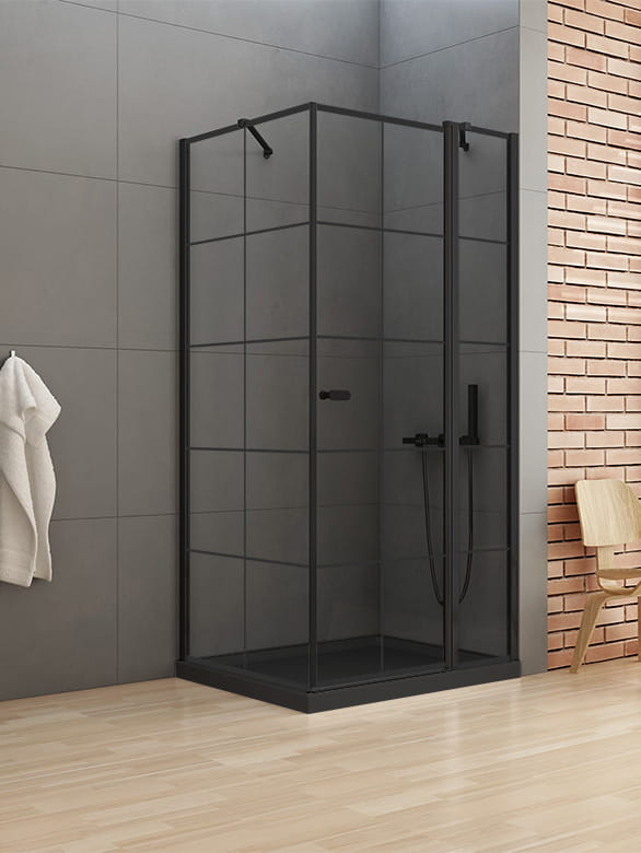 kabina kwadratowa, drzwi uchylne pojedyncze otwierane na zewnątrz i do wewnątrz, bezpieczne hartowane szkło 6 mm pokryte powłoką ochronną Active Shield