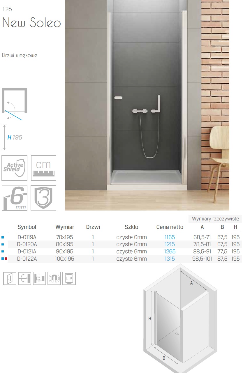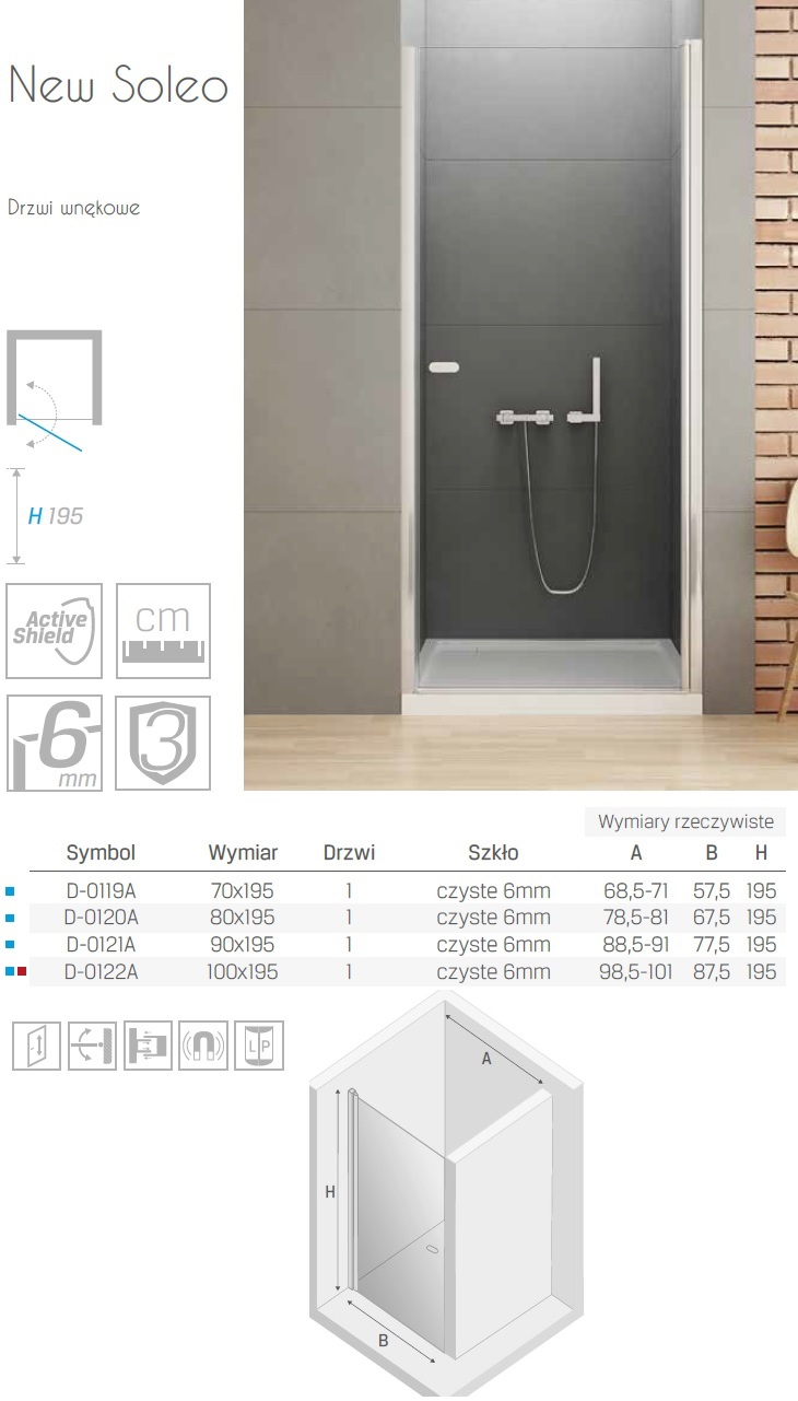Producent New TrendyNew Trendy D-0122A NZ Drzwi prysznicowe NEW SOLEO pojedyncze100x195 drzwi uchylne pojedyncze szkło czyste 6mm Active Shield