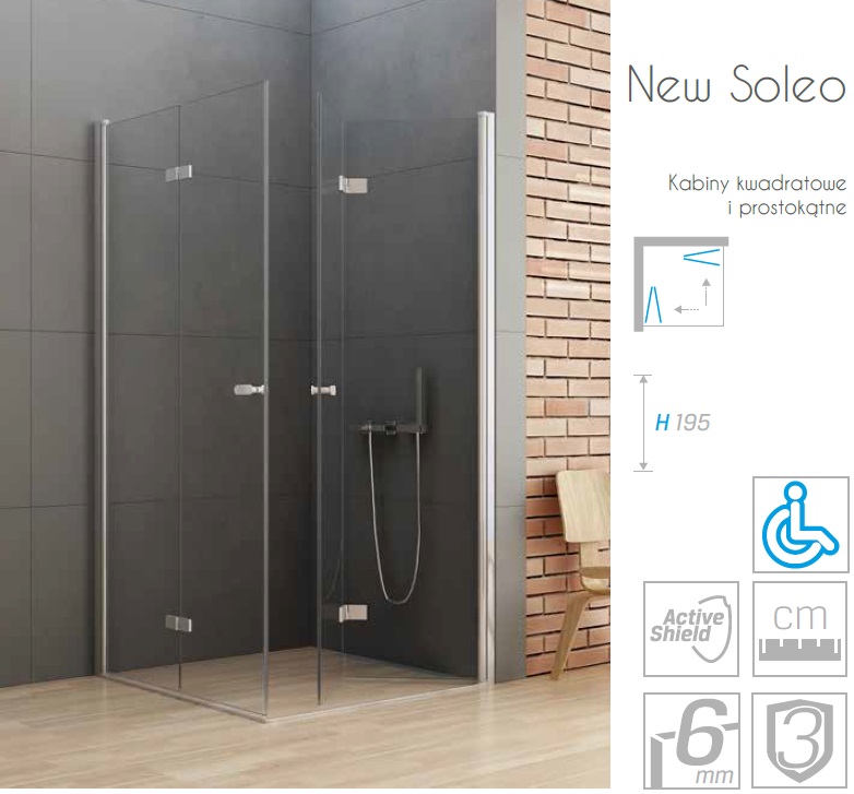 Kabina prysznicowa z podwójnymi drzwiami składanymi, uchylnymi otwieranymi na zewnątrz i do wewnątrz. Zawias kolumnowy zastosowany w drzwiach NEW SOLEO zapewnia niezwykle szerokie wejście.