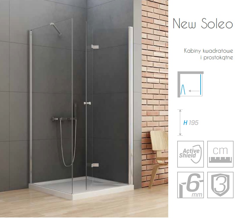 Kabina prysznicowa z pojedynczymi drzwiami składanymi, uchylnymi otwieranymi na zewnątrz i do wewnątrz. Zawias kolumnowy zastosowany w drzwiach NEW SOLEO zapewnia niezwykle szerokie wejście.