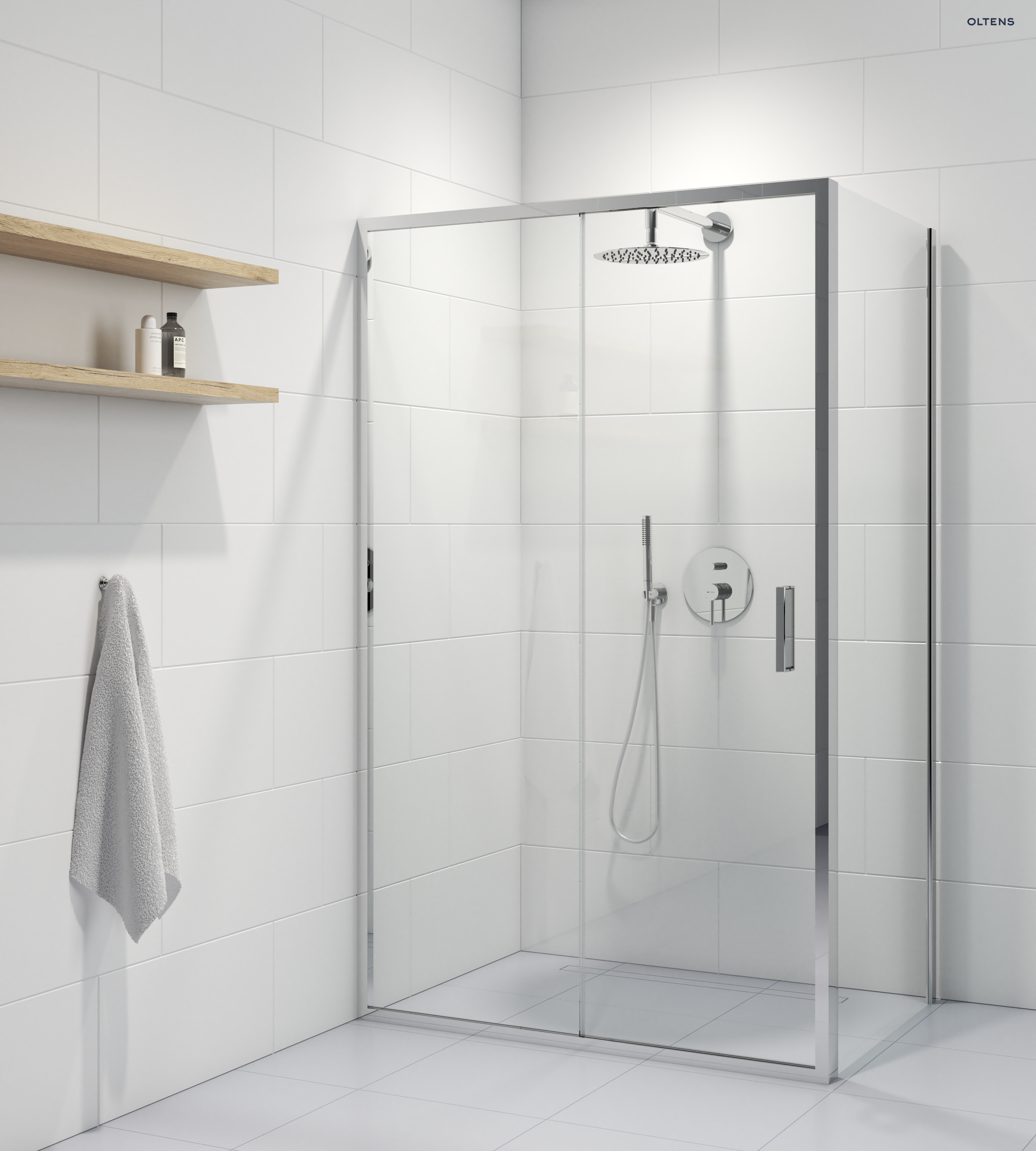 Kabina prysznicowa prostokątna z drzwiami przesuwnymi, szkło przezroczyste gr. 6mm z powłoką Oltens SmartClean nakładaną w procesie produkcyjnym po obu stronach szyby.