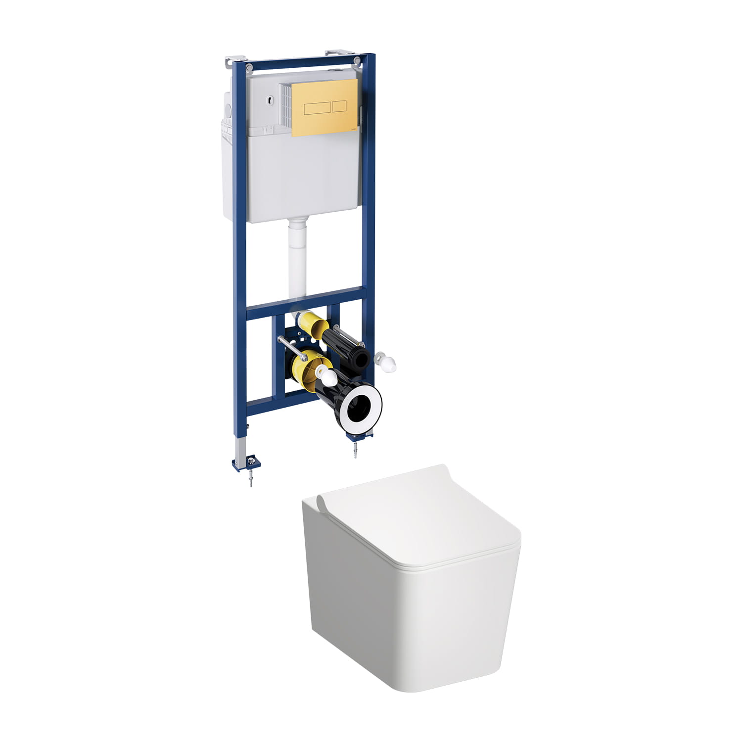 W zestawie znajduje się wisząca miska toaletowa OMNIRES BOSTON z deską wolnoopadającą oraz stelaż podtynkowy OMNIRES CLASSIC ze złotym przyciskiem spłukującym.