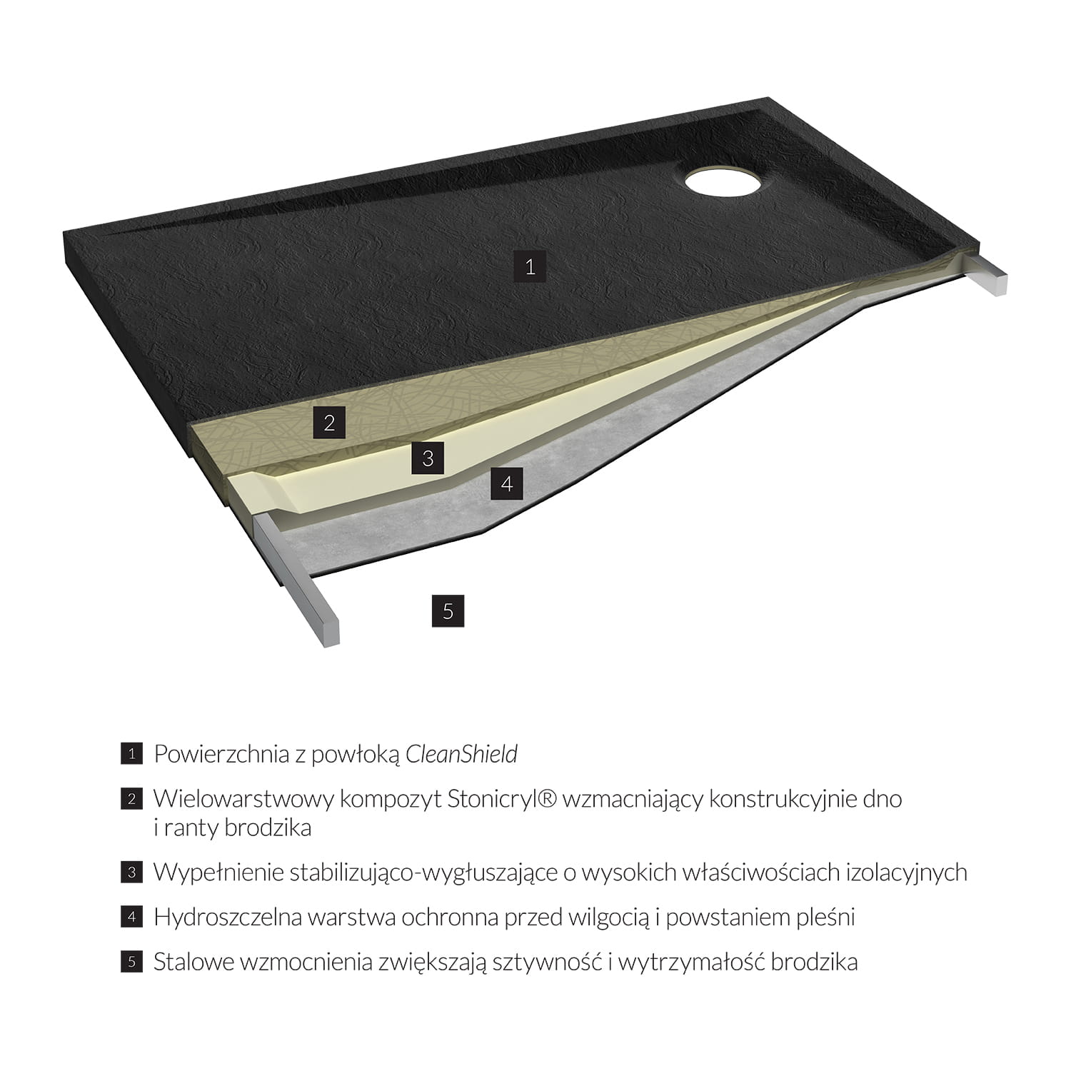 Brodzik został wykonany z wielowarstwowego materiału kompozytowego, który zapewnia niezwykłą trwałość i wytrzymałość. Matowa powierzchnia brodzika o strukturze naturalnego kamienia pokryta jest dodatkowo powłoką antybakteryjną CleanShield, która poprawia właściwości higieniczne, jednocześnie ułatwiając czyszczenie. Podbudowa stabilizująca usztywnia brodzik, zapewnia izolację termiczną i akustyczną. Warstwa uszczelniająca chroni przed wilgocią i powstawaniem pleśni. Brodzik można montować klasycznie na posadzce lub na równi z podłogą. Może być on również przycięty w celu idealnego dopasowania się kształtem do przestrzeni łazienki.