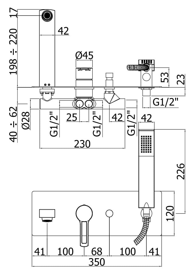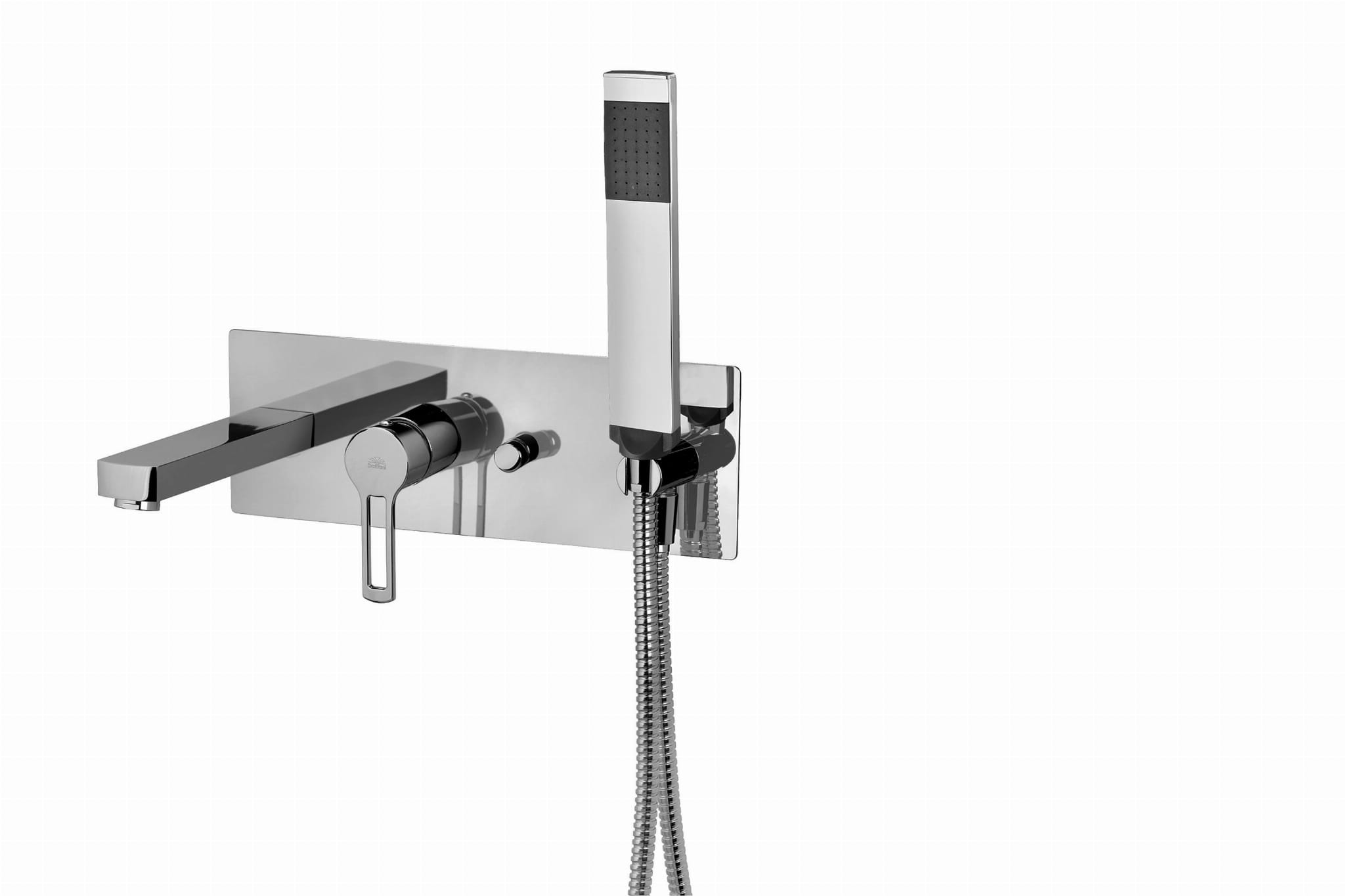Kompletna bateria wannowo-natryskowa z przełącznikiem, wylewką i zestawem natryskowym.