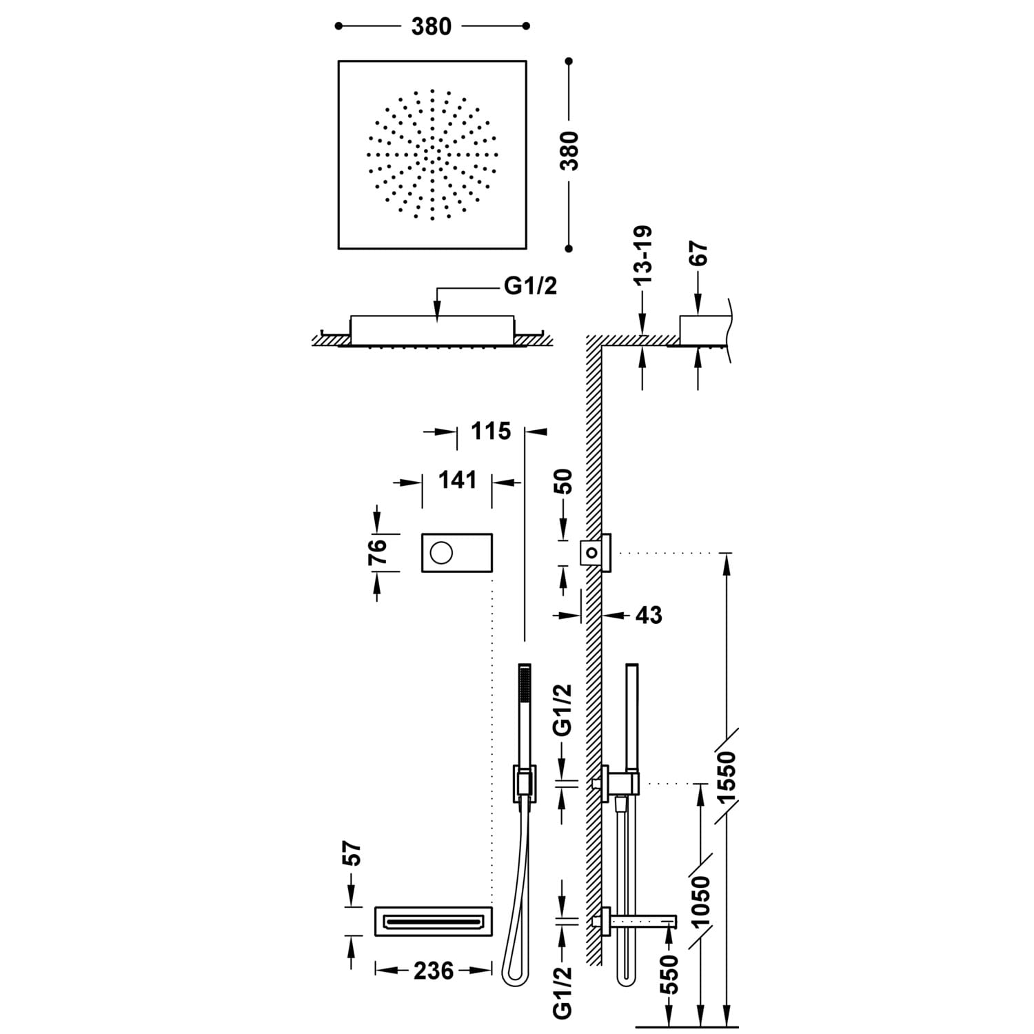 · Deszczownica podtynkowa sufitowa ze stali nierdzewnej: 380x380 mm. WAŻNE: Zamontować spust >50 l/min