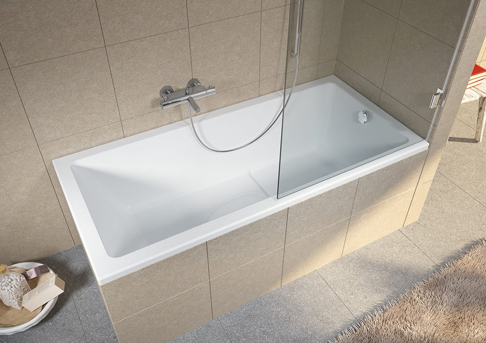 Prostokątna wanna do zabudowy ze strefą prysznicową.