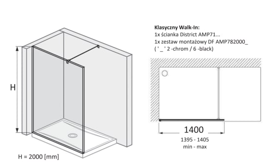 Ścianka Walk-In, grubość 8mm, do łączenia z zestawem montażowym District. Wymiar nominalny 140cm