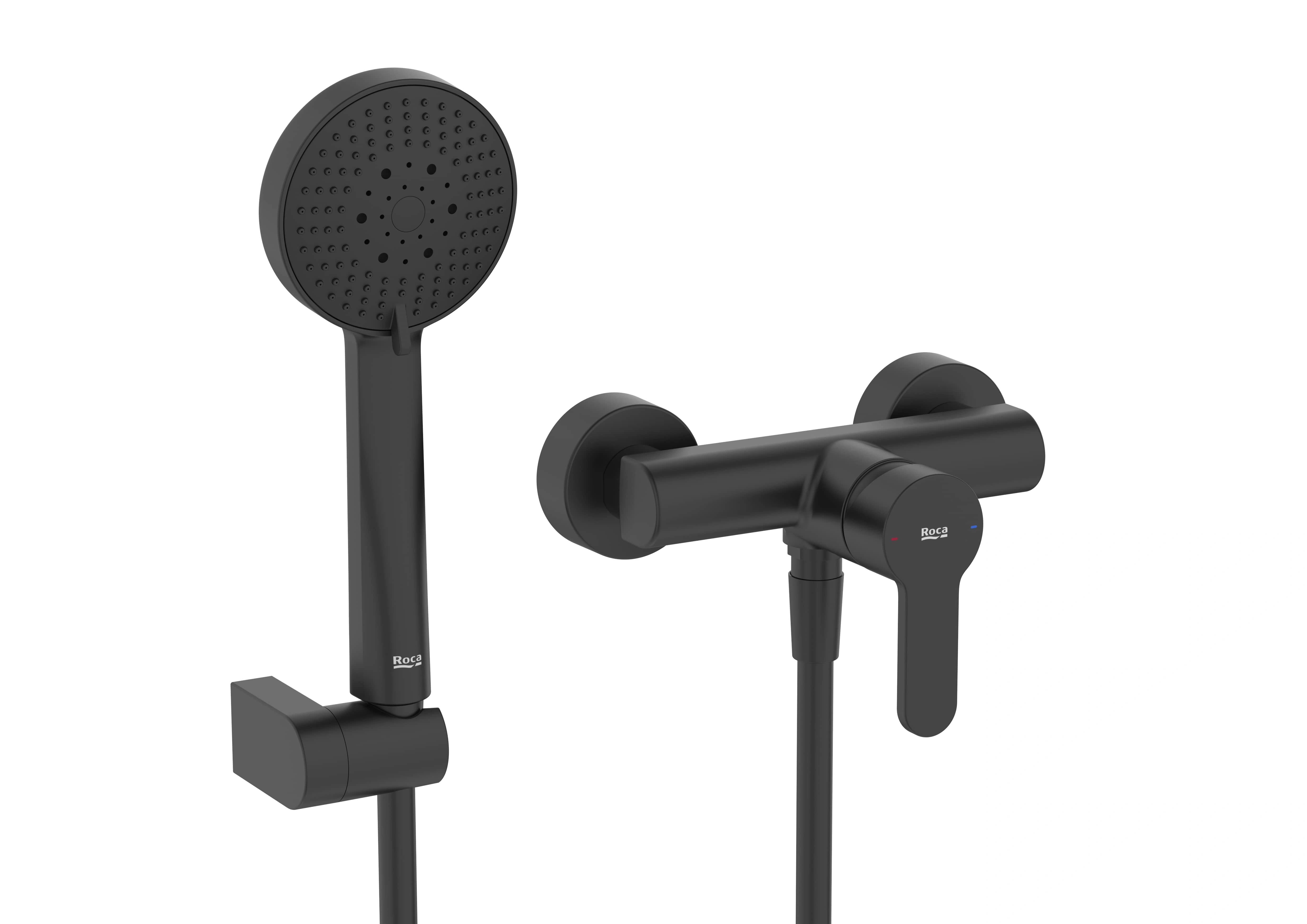 Roca L20 ROUND Jednouchwytowa bateria prysznicowa ścienna z zestawem prysznicowym, Czarny mat. A5A209HNB0