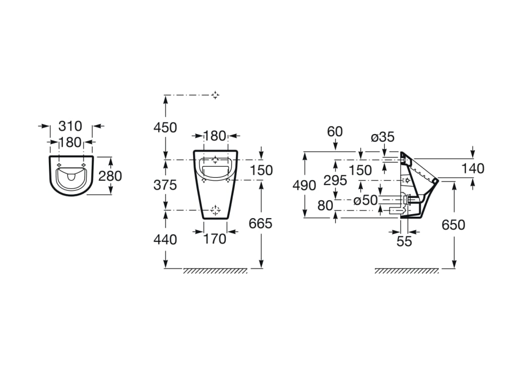 Roca NEXO pisuar z dopływem z tyłu (zestaw montażowy, przyłącze zasilające 1/2", bez syfonu). A35364L000