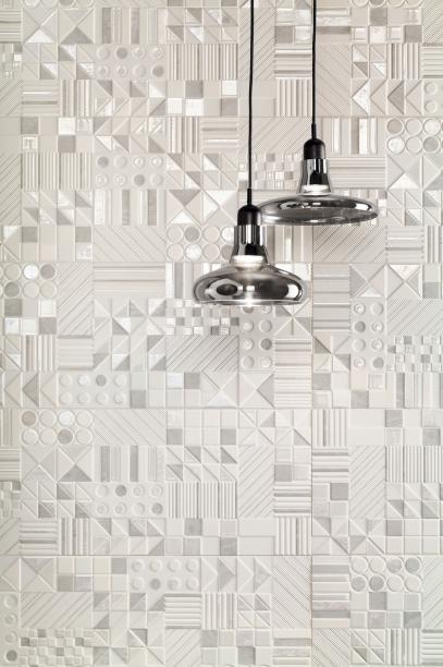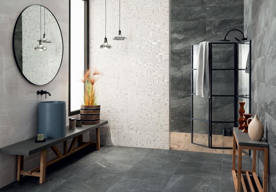 Stworzona dla wielbicieli mocnych akcentów. Jasna płytka łagodzi surowy charakter bazaltu, a geometryczne, lśniące dekoracje z elementami platyny kontrastują ze strukturą kamienia.
