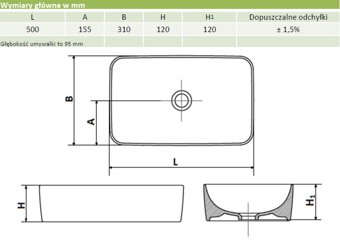 Vitalle ROANA Square 50 umywalka ceramiczna nablatowa prostokątny 500 x 310 x 125 mm