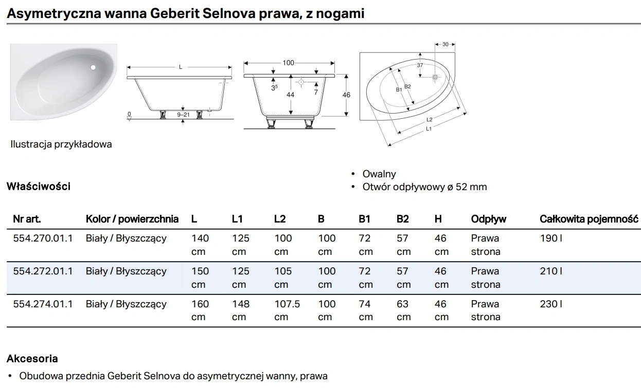 Wanna asymetryczna Geberit SELNOVA prawa 150x100 z nogami. 554.272.01.1