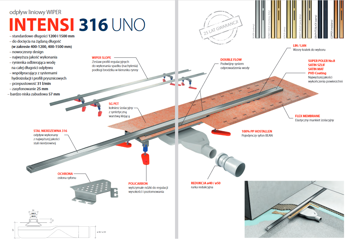 Rynienka prysznicowa INTENSI 316 UNO została zaprojektowany z myślą o najnowszych trendach i oczekiwaniach rynku. Jego bardzo niska zabudowa pozwala na montaż w trudnych warunkach. Rynienka dostępna w dwóch wariantach z możliwością docinania na żądaną długość, powoduje, że idealnie wpasowuje się w rozmiar brodzika. Wyposażona jest w syfon SNAKE BEAN. Odbiera wodę na całej długości. Standardowa długość bazy to 300 mm natomiast zestaw rynny i kratki to długość 1200 mm. Całość wykonana z certyfikowanej stali gat. 316 poler, szlif lub mat. PVD (Physical Vapour Deposition) to proces fizycznego osadzania cienkich warstw z fazy gazowej, prowadzony w warunkach wysokiej próżni. Powstała w tym procesie powłoka, charakteryzuje się wszechstronnymi właściwościami. Najważniejsze z nich to: doskonała jakość kolorów i szeroka ich gama, wysoka odporność ścierna i antykorozyjna, wysoka stabilność termiczna i obojętność chemiczna.