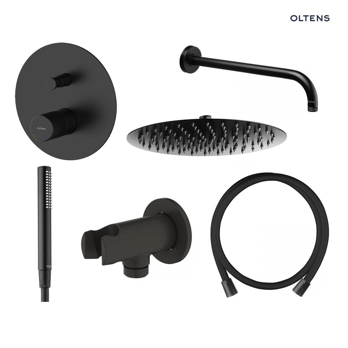 Zestaw Oltens Hamnes bateria podtynkowa z deszczownicą 30 cm Vindel i kompletem prysznicowym Ume czarny mat 36607300